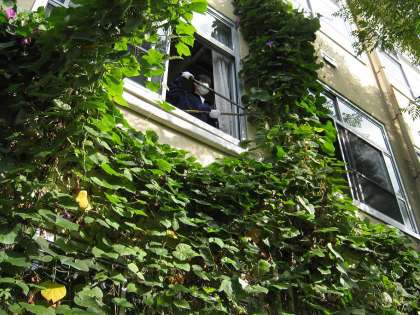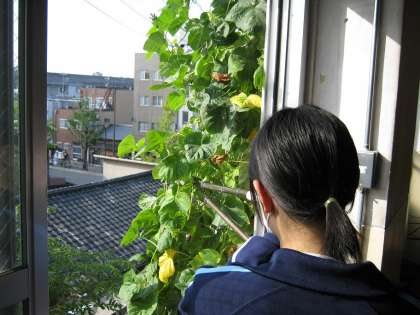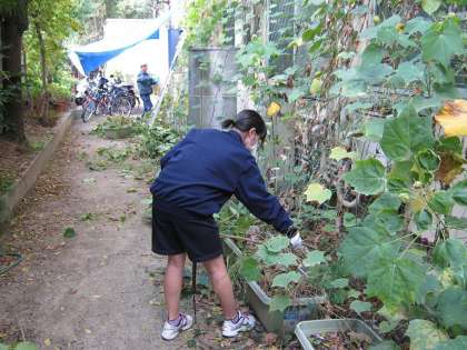 本日は女子生徒1名が学校でチャレンジ体験をしました。本館の南側のみどりのカーテンで育てたゴーヤの葉や朝顔のつるを取り除きました。朝顔のつるは雨樋に想像以上に複雑に絡んでおり、取り除くのが大変でした。しかし、女子生徒のがんばりでずいぶんスッキリした状態になりました。ありがとう、ご苦労様でした。