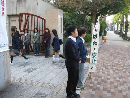 PTA朝の声かけ運動実施! 公開日 2012/11/08 更新日 2012/11/08 PTAより 朝8時から校門で「おはようございます」と明るい声が聞こえます。きょうはPTA校外補導委員会の取り組みである「第3回朝の声かけ運動」の実施日です。生徒会で取り組んでいる東北大震災の義援活動と時間が重なり、朝から校門付近では元気な挨拶の声が響いていました。