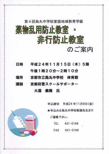 先日プリントでもご案内いたしましたが、明日11月15日(木)に烏丸中学校体育館で、「第4回家庭地域教育学級 薬物乱用・非行防止教室」を開催いたします。
