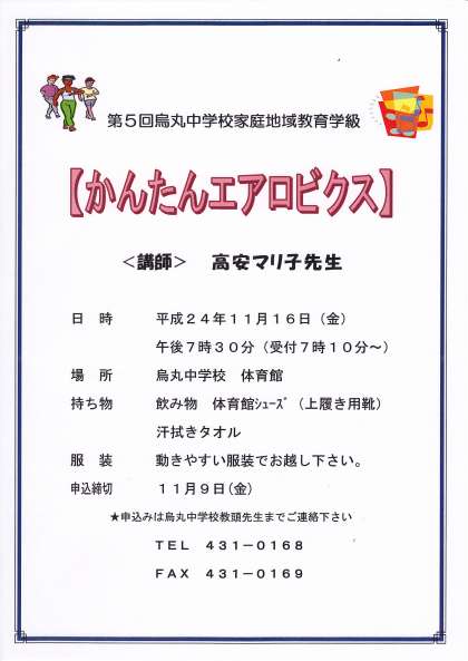 今日11月16日(金)午後7時30分より烏丸中学校体育館で、第5回家庭地域教育学級「かんたんエアロビクス」を実施します。日頃の運動不足解消と健康維持のためにも、是非多数ご参加ください。