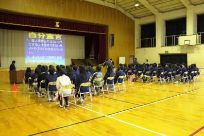 明日の本番へ向けて、今日の6時間目に3年生は体育館でのリハーサルを行いました。スムーズに進行するように、綿密な練習をしていました。明日は多くの皆様に来校していただき、生徒たちの取り組みを参観していただければと思います。