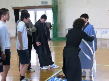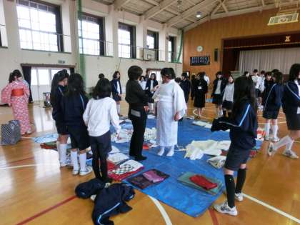 着付け体験が始まりました。女子は、たくさんある着物の中から気に入ったものを選んで着付けをしていただきます。男子は、同じような着物ですが、よく見ると、細かい柄や織り方に違いがあります。奥深いですね。
