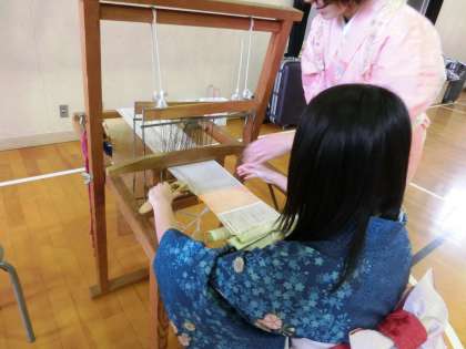 気付を待つ間や、気付が終わった人から順に、機織りの体験をしました。細かい作業でなかなかうまくいきません。でもこんなに時間をかけて、丁寧な作業であのような素晴らしい着物や帯が作られているのです。すごいですね!