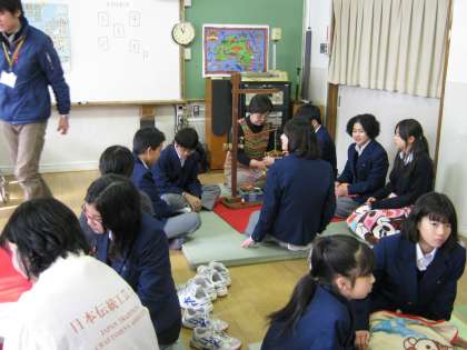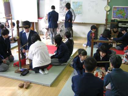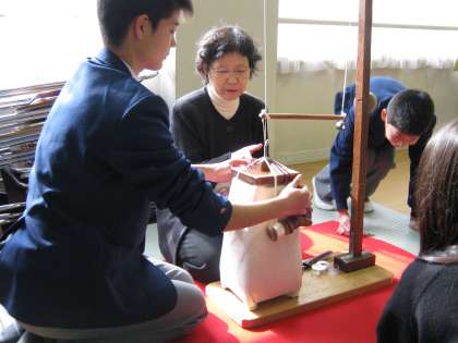 今日は1年生が組紐制作に挑戦しました。一人一人が好みの色紐を選び、慣れない正座でワクワク・ドキドキしながら制作を始めました。西陣織工業組合のみなさんに全員が丁寧に手ほどきしていただき、楽しく笑顔いっぱいに伝統工芸技術にふれることができました。