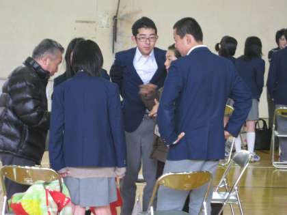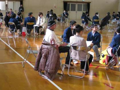 きょう2年生が「ふれあいとーきんぐ」にチャレンジしました。人づくり21世紀委員会」の上京区内に住んでおられる大人の方々と中学生たちが、さまざまなテーマで話をしました。始めはどんな話をするのか、まったく知らない大人と何を話せばいいんだろうか?と少々緊張気味の生徒たちでしたが、人づくり委員会のみなさんによる順番並びゲームなどのアイスブレーキングにより、徐々に緊張がほぐれ笑顔が出てきたところで、「ふれあいとーきんぐ」が始まりました。話し合われた内容は多岐にわたり、教育・友達・家庭・反抗期・生き方チャレンジ体験・部活動・授業・尖閣列島問題・体罰・将来の夢等々と各グループごとに様々な話が飛び交い、大いに盛り上がりました。