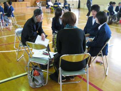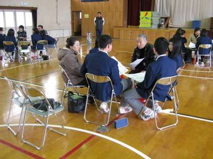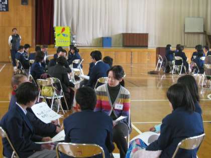 「ふれあいとーきんぐ」も終盤にさしかかる頃には、体育館内のいたるところから笑い声が聞こえ、子どもも大人もいっしょになって、たいへん良い雰囲気の中で、各グループからの最後のまとめと感想の発表の時間を迎えました。話し合われた内容は、政治的なことや人生訓のようなものまで、ほんとう多岐にわたったものでした。感想は、どのグループも、とても楽しく為になるものばかりであったというものでした。きょう本校生徒のために寒い中を、貴重な時間を割いて来校いただきました人づくり21世紀委員会」の皆様、生徒たちに貴重な体験をさせていただき、本当にありがとうございました。この経験は、きっと生徒たちの人生に役立つものになっていくことと思います。