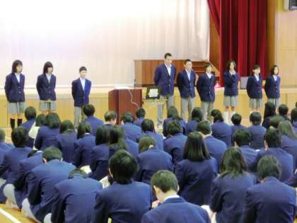 校歌斉唱の後、生徒会本部からの呼びかけがありました。その後は表彰です。今日は「百人一首大会」の学年別表彰、「京都市中学校生徒書き初め展」、「ドイツとの交換作品」の3つの表彰がありました。