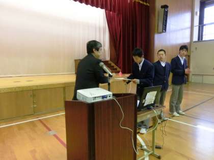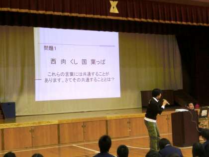 次は先生方からのお話しです。今日の担当は木村先生と岩本先生です。今回は二人一緒に、「頭の体操クイズ大会」をしていただきました。10問のクイズが出題され、各学年+教職員の4チームでの争いです。難しいクイズもありましたが、どんどん手が上がり、白熱した対戦です。結果は、最終問題に正解した3年生が優勝しました。楽しいひと時を過ごしました。