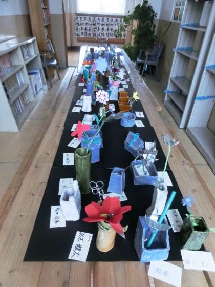 なお、3階のいこいの広場では、美術で製作した花器に、それぞれが作ったペーパーフラワーを活け、作品展が開催されています。可愛い作品が多くて、微笑ましいですね。