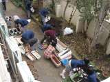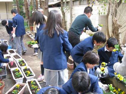 先日ひきにつづいて、きょうも花の植替え作業をしました。きょうは、ときどき雪の舞う寒い中を、1・2年生の美化委員と自発的に手伝いに来てくれた多数の生徒で、額にうっすらと汗をうかべながら、一生懸命に花の植替え作業に取り組んでくれました。おかげで予定より短時間で作業を終えることができました。寒い中をがんばってくれた生徒のみなさん。ありがとうございました。きょうも花の植替えで指導していただいたボランティアの田中さん。ありがとうございました。
