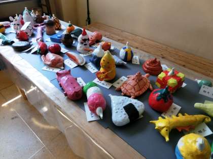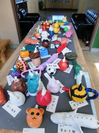 2階の憩いの広場には、2年生が美術の時間に制作した「オカリナ」が展示されています。作品を見た瞬間、「このオカリナ、音が出るの?」と思ってしまうようなユニークな作品に仕上がっています。制作者の個性が光るほのぼのとした楽しい作品です。