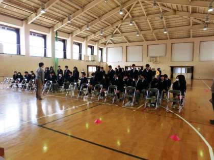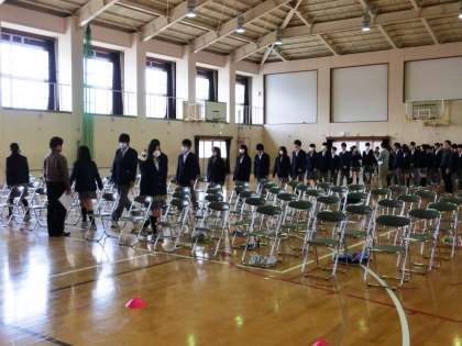 2時間目からは、全体の流れをもとに、式開始からの動きを確認し、練習しました。体育館の座席への入場と着席、そして卒業生が最も緊張する卒業証書授与です。初めての動きで戸惑っている人も多かったようですが、卒業生が”主役”の卒業式です。元気よく、堂々と、自信を持って、しっかり前を向いて歩いてください。そして大きい声で”はい!”の返事をしてください。主役の単独のセリフはこの”はい!”しかありません。3年間の思いを込め、会場に参列していただいた多くの方々、特に皆さんの保護者の方に届ける”はい!”です。ここで大きく元気な声を出さないなら、いったい何時出すのか?”今でしょ!”卒業式の当日を期待しています!