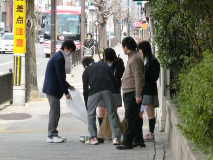 しかし、その掃除を邪魔したのが”突風”です。花粉、黄砂、pm2.5?等が風に舞い上がり、空はどんよりと曇り、息苦しさも感じます。でも3年生の皆さんは、”風にも負マケズ・・・”てきぱきと掃除をしてくれました。本当にありがとうございました。
