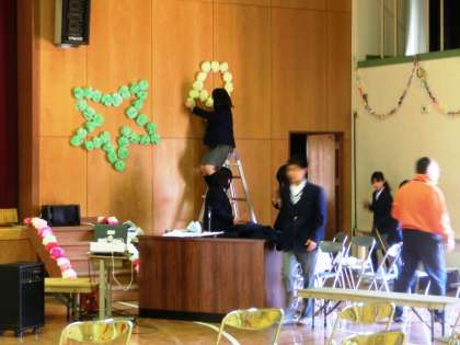 放課後体育館では、明日の送る会の準備と飾り付けが行われています。1・2年生の委員の人たちが、気持ちを込めて準備をしてくれています。どんな舞台が完成するか、明日が楽しみですね!