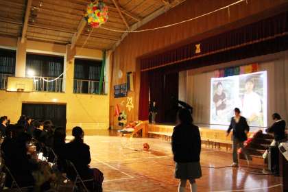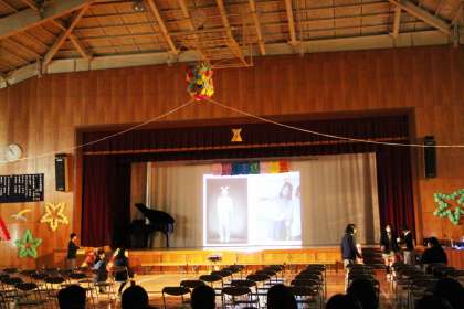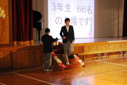 いよいよ3年生の入場です。舞台の上から、一人ひとりの写真が映し出され、左右に分かれて入場が始まりました。階段を降りたところで、手製の”コサージュ”のプレゼントです。長い時間をかけて1年生が制作してくれました。今日の3年生を送る会と明後日の卒業式に胸を飾ってもらおうと、頑張って作りました。笑顔が輝いています。