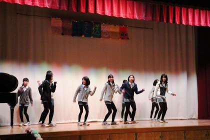 次は1年生の発表です。最初に9名の女子によるダンスです。少女時代の音楽に合わせ、9名が練習の成果を披露してくれました。とても可愛くて、キュートでした。