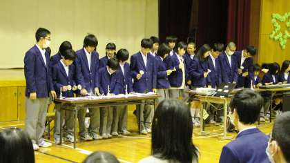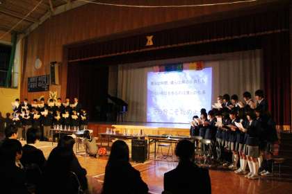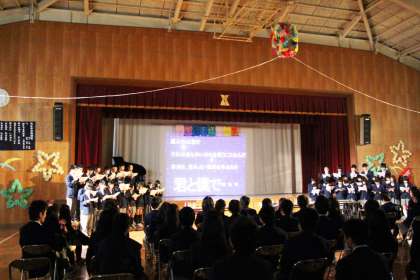 続いて「ウィー・アー・ザワールド」を英語で合唱してくれました。英語での合唱はとても難しく、なかなかバランスがとりにくいものです。さすが2年生、体育館に響く合唱でした。「明るい明日を作るのは僕らの仕事、さあ今こそ始めよう!」3年生の明日からの飛躍を期待する、とても元気一杯の合唱でした。2年生の皆さん、本当に有難うございました。