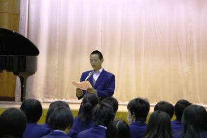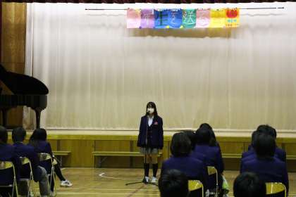 楽しかった3年生を送る会もエンディングの時を迎えました。在校生からのお別れと感謝の言葉に続き、3年生からのお礼の言葉です。今日の日のために、長い時間をかけて取り組んだ生徒会本部の皆さんや1・2年生全員に対する感謝の言葉を述べてくれました。充実した時間を過ごしました。