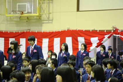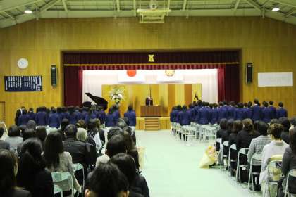 思い出に残る卒業式−1 公開日 2013/03/15 更新日 2013/03/15 学校の様子 卒業式が始まりました。卒業生66名の入場です。みんな晴れやかな顔です。国歌・校歌斉唱の後、いよいよ卒業証書の授与です。練習の成果が表れ、全員が堂々と卒業証書を受け取っていました。学校長式辞では、緊張感を保って耳を傾けてくれていました。