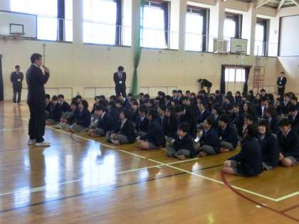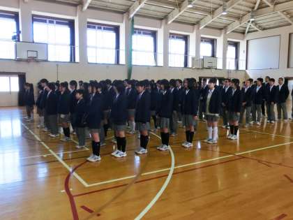 着任式の次は始業式です。いつもの通り、集会の最初は校歌斉唱です。毎回歌っているので、ほとんどの人は歌詞を覚えているようです。でも、声量はいまいち・・・。春休み中で声を出す機会が少なかったからでしょうか?明日の入学式では、+α元気一杯の歌声で、新入生を驚かせてあげてください。