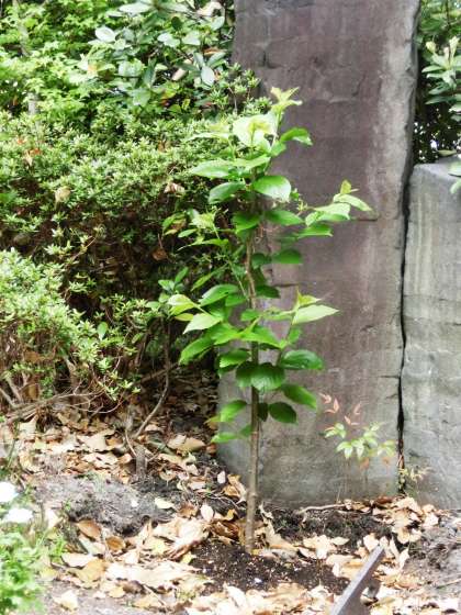 2月22日の放課後、旧生徒会本部の皆さんに、玄関のさつきの植え込みの中に卒業生を送る桜「春めき」の苗木を植樹してもらいました。植樹から2カ月が過ぎ、苗木は立派に成長し、青々とした立派な葉をつけています。苗木の横に「春めき」の立礼も完成しました。
