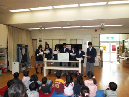 新年度に入り、忙しい中ですが、生徒たちは自主的に参加して頑張ってくれました。練習の時は、語り口調が早くて、少し心配でしたが、実際に小さい子どもたちを前にする、とても上手に読み聞かせや、エプロンシアターの語りができていました。子どもたちも、食い入るような目で真剣にみてくれて、図書館、児童館の職員さんたちは、「こんなに静かに聞くなんて!」と驚いておられました。そして、「毎月でも来て欲しいです!」と言われたのでした。
