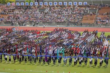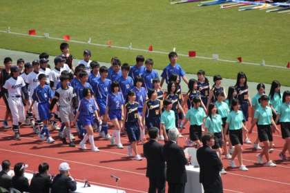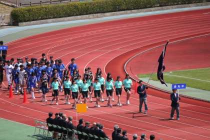 第55回京都市中学校春季体育大会開会式行われる 公開日 2013/04/29 更新日 2013/04/29 部活動2013 4月29日(祝)午前10時、鮮やかに晴れ渡った青空の下、第55回京都市中学校春季体育大会開会式が7405人の大選手団と共に盛大に行われ、烏丸中学校の選手も堂々と入場行進を行いました。校長会を代表して会長の村上正治先生から、激励の言葉もいただき、いよいよこれから始まる試合に胸が高まる思いです。