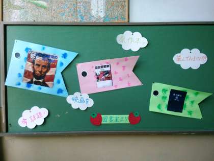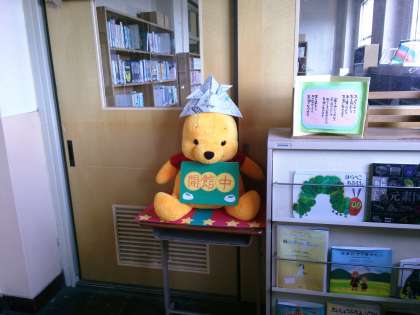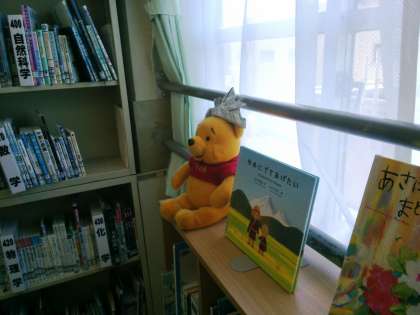 図書館掲示のリニューアル 公開日 2013/05/07 更新日 2013/05/07 学校の様子 先週、図書支援員の先生と学生ボランティアさん、総合育成支援員の先生等の協力を得て、図書館前の掲示物をリニューアルしました。ぬいぐるみが雪だるまからプーさんに変わり、端午の節句にちなんでかぶとをかぶせました。ほのぼのとしていますね・・・一度ゆっくりと図書館へ足を運んでください。