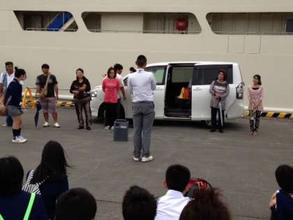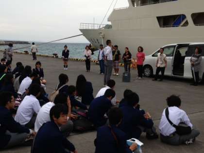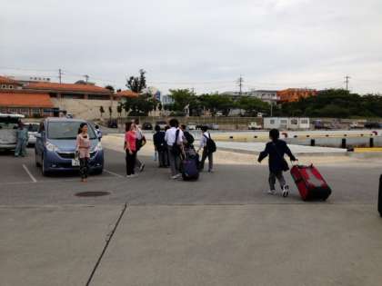 伊江島に着きました 公開日 2013/05/09 更新日 2013/05/09 3年修学旅行 修学旅行一日目 短い船旅を終え、全員元気で、伊江島に到着しました。「お帰りなさい」の垂れ幕に迎えられ、伊江島での体験の始まりです。港で入村式をした後、それぞれのお宅へ出発しました。どんな所か、楽しみです。 今日の情報は、これで終わりまはす。
