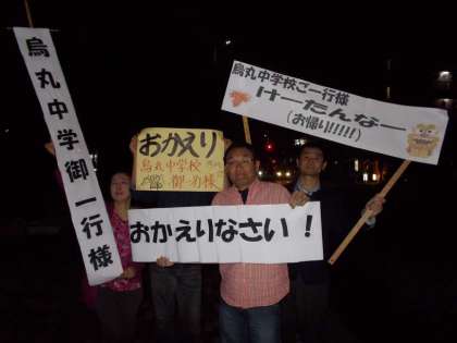 学校到着!!お帰りなさい!! 公開日 2013/05/11 更新日 2013/05/11 3年修学旅行 修学旅行三日目 そして8時過ぎ、バスはようやく烏丸中学校に戻ってきました。夜間にも関わらず、たくさんのお出迎えの中、みんなほどよい疲れといっぱいの思い出を胸に、三日ぶりの学校に元気に戻ってきました。きっと体は思っている以上に疲れていることでしょう。今日はお風呂に入ってゆっくりと体を休めて下さいね!!
