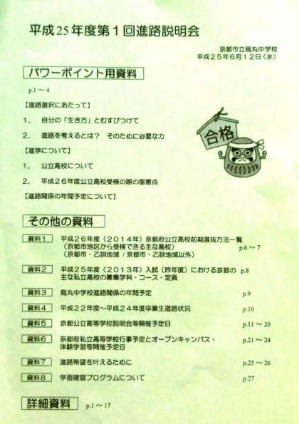さて、その際に配布させていただいた「平成25年度第1回進路説明会」の資料の中に閉じてありますように、「進路だより No.4〜No.8」を発行いたしました。是非生徒と共にゆっくりと目を通していただければと思います。