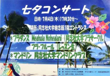 明日4日(木)午後5時30分から、同志社大学継志館(今出川通新町下ル)で、「七夕コンサート」が開催されます。会場には、烏丸中学校の全校生徒と教職員の”願い”が短冊に込められた巨大な笹飾りが設置されます。時間のある方は、是非コンサートに参加してください。なお、笹飾りは明日はいつでも見ることができます。