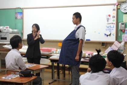 洛陽総合高校からは、生まれたばかりの赤ちゃんを題材に保育の体験授業をして頂きました。妊婦さんの体験をしたり、実物と同じ赤ちゃん人形を抱いて、パパママの気分を味わったり・・・。