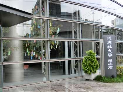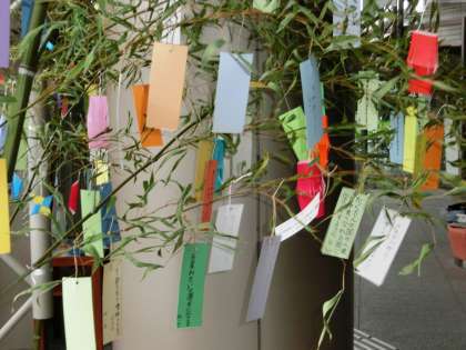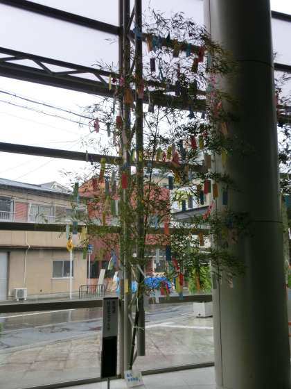 今日同志社大学継志館で「七夕コンサート」が開催されますが、その会場の正面に大きな笹飾りが設置されました。今年も短冊に、烏丸中学校と室町小学校の生徒・児童・教職員の願いが込め、笹飾りが会場に映えています。あいにくの空模様ですが、「世界が平和になりますように」という大きな願いから、「お小遣いが増えますように」という可愛いものまで、様々な思いで笹が大きく揺れていました。7月7日は、素晴らしい星空が見られますように・・・!