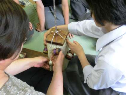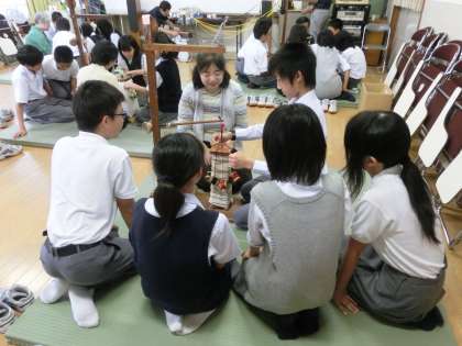 1年生は午前中、組紐作りを行いました。今年は、老人の皆さんへのプレゼントも含め、1人が2本のキーホルダーを製作しました。西陣中央小学校出身の生徒の皆さんは、3年生で体験をしたこともあり、慣れた手つきで組紐を編みあげていきました。初めて体験した生徒もすぐにコツをつかみ、予定通り素晴らしい作品に仕上がるいました。指導していただいた皆さんには、本当にありがとうございました。