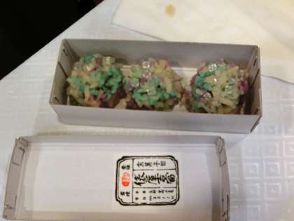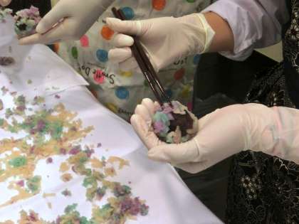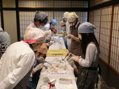 3階の会場では和菓子作りを体験しました。今年のテーマは「あじさい」です。色とりどりの花びらの上に、寒天でできた朝露が乗っている、よく目にするお菓子です。丸めた粒あんを核にして、お箸で周りに少しづつ花びらを付けていきます。大きすぎたり、小さすぎたり、力を入れすぎてつぶれたり・・・手先の器用さが求められる繊細な作業です。でも1時間後には、全員がお土産の3個のお菓子を完成していました。残った花びらは・・・?もちろんその場で頂きました。今日は素晴らしいお土産が出来ましたね。「美味しそうに出来たやろ!」家での”自慢話”が楽しみです・・・。