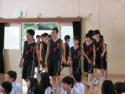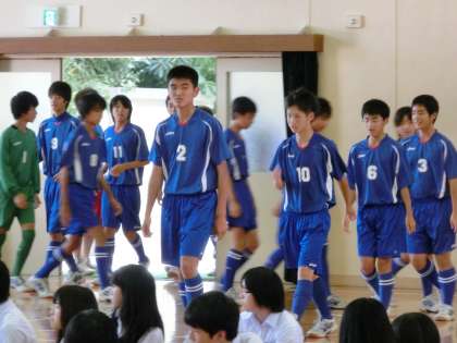 サッカー部を先頭に、体育館へ選手が入場してきました。堂々とした行進です。2番手は男子バスケットボール部、1年生が入部したので、春体の時の寂しさはありません。まずは1勝!
