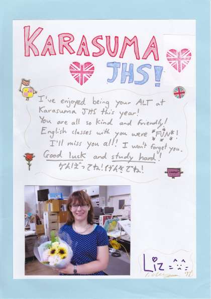 去年の夏休み明けから1年間、烏丸中にALTとして勤務いただき、英語の授業でお世話になった、ワルンビ・エリザベス先生が今日でお辞めになることになりました。いつもにこやかで優しい笑顔は、生徒に皆さんにとっては、お姉さんのような存在だったと思います。本当にありがとうございました。今後のご活躍をお祈りします。