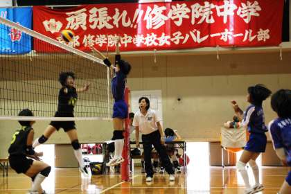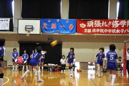 女子バレー部は、21日(日)午前11時30分より、修学院中学校で、西賀茂中学校と対戦しました。女子バレー部は部員が少ないため、春季大会までは上京中学校との合同チームで試合を行って来ましたが、1年生が7名入部し、今年度初の公式戦に挑みました。とはいえ、1年生が3名も出場するフレッシュなチームでわありますが、試合経験はやや不足しています。それに引き換え、相手の西賀茂中学校は、部員数30名を超える大人数、伸長を大きく、スパイクのスピードの凄いものがあります。今回の試合では、かなりの力の差が出るのでは・・・との予想に反し、開始直後から互角以上の試合展開で、一進一退のラリーが続きます。しかし、体力とスピードの違いが徐々に点差を広げ、第1セットは18−25で先取されてしまいました。