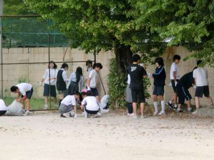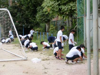「全校美化活動」・・・1年生はグランドの雑草除去作業! 公開日 2013/08/23 更新日 2013/08/23 学校の様子 1年生はグランド周りに多い繁っている雑草の除去作業を担当しました。夏を乗り越えてきた”強力”な雑草たちが、びっしりとグランドの周りを埋めています。「これは雑草ですか?」という疑問を投げかけた生徒もいましたが、全部雑草なのです。地面に這いつくばる地道な作業ですが、時間いっぱいまで丁寧に草抜きをしてくれました。とてもきれいになりました。野球のボールも発見!