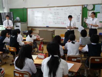 そんな折、今日は様々な場面でコラボしている同志社大学の学生サークルの中から、毎年応援に来て下さっている男声合唱団グリーのみなさんが、烏丸中学校を訪れ、9人の方が体育館・教室・音楽室で練習している3つの学年に分かれ、さらにパート別に分かれて、発声の仕方や音の取り方、表現の仕方などきめ細かに指導して下さいました。本番では毎年素晴らしい模範演奏を披露して下さるグリーのみなさんですが、毎年指導に訪れる中で、去年も指導した生徒が大きく成長する姿を目の当たりにし、反対に褒めて下さる場面もありました。