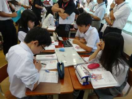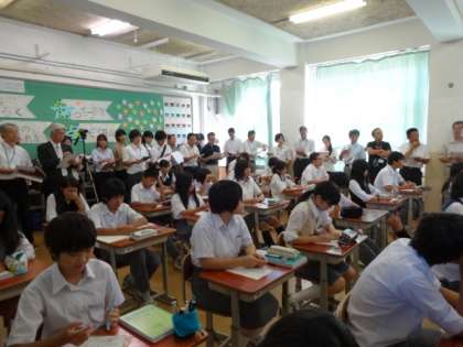 烏丸中学校では、年は理科を担当し、2年2組の授業を岩本先生にしていただきました。京都市教育委員会の生田教育長様、総合教育センターの山本主任指導主事様をはじめ、30名を超える先生方に参加していただき、大変盛り上がった研修会となりました。授業クラスの2年2組の生徒の皆さんは、生徒数より多い参観者にドギマギしながらも、一生懸命に授業に取り組んでいました。