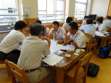 授業終了後は、いきいき交流ルームで研究協議会を行いました。今日の授業内容についてや、今回のテーマである「言語活動を取り入れた授業改善」に沿って、予定時間を超過するほどの熱心な協議会となりました。今日の研修会の成果は、これからの北・上京支部の理科授業に生かされると思います。北・上京支部では、これからもさらに研修を深めていくつもりです。参加された皆さん、本当にお疲れ様でした。