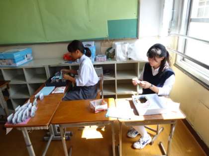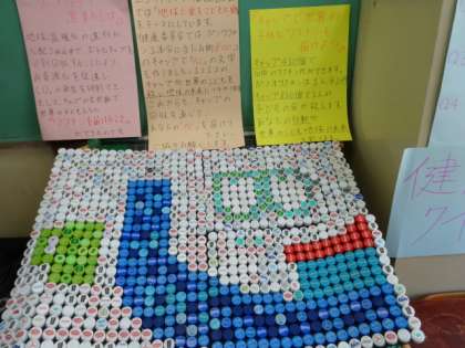 それ以外にも、ずっと続けているエコキャップ運動を活かして、エコキャップアートを制作したり、環境によいグッズとしてコーヒーの出し殻を使った消臭グッズの紹介などを行っていました。