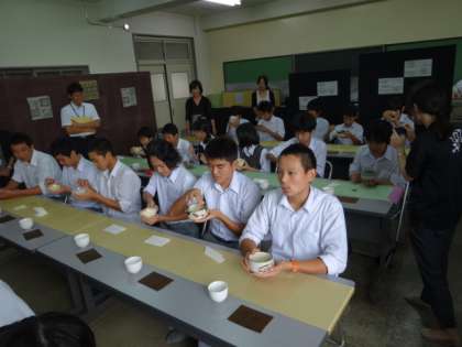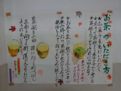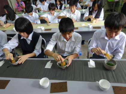 各学年クラスごとにまずはお菓子をいただいてもらい、続いてお抹茶のたてかたを教えてもらい、器の持ち方、回し方、いただきかたなど基本的な作法の下、少し苦いけれど甘いお菓子の後にはちょうどの苦みを楽しむことが出来ました。