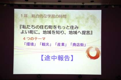続いては1年生の発表です。1年生は総合的な学習の時間を中心に「私たちの住む町をもっと住みよい町にするために−地域を知り、地域へ提言−」というテーマで学習を進めています。特に全員を「環境」「観光」「産業」「商店街」の4つのテーマに分け、夏休み中にグループごとのフィールドワークを行いました。今回はその中間報告です。