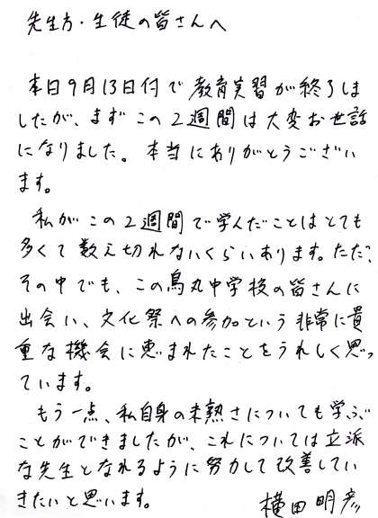 8月30日から9月13日迄の2週間、様々な場面でお世話になった、教育実習生の横田先生が実習期間を終了されました。3年生の社会科の授業を中心に、3年2組の学級活動や文化祭にも協力いただきました。本当にありがとうございました。今後のご活躍をお祈りします。