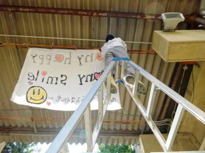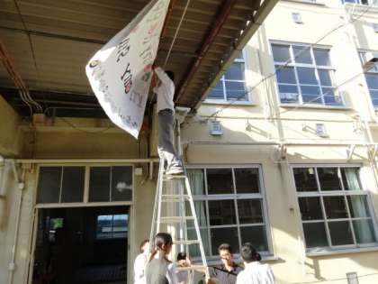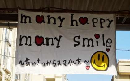 生徒会目標の垂れ幕を設置しました! 公開日 2013/09/18 更新日 2013/09/18 学校の様子 夏休み中のリーダー講習会の際に作成した今年度の生徒会目標の垂れ幕を、生徒会執行部の皆さんが渡り廊下に設置してくれました。「many happy many smile 〜あいさつからスマイルを〜」のロゴが渡り廊下に揺らめいています。これからの1年間、この目標で烏丸中学校をもっともっと”あいさつ”と”からスマイル”溢れる学校にしていきましょう!