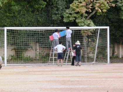 明日の体育祭へ向けて、準備開始! 公開日 2013/09/30 更新日 2013/09/30 学校の様子 いよいよ明日は、待ちに待った体育祭です。午後から準備が始まりました。テント設営、本部席設営、用具準備、得点版設置、ライン引き、装飾、校内清掃などそれぞれの担当に分かれ、スムーズに準備が進んでいます。明日は素晴らしい会場で、思い出に残る体育祭になることを確信しています。今までの練習の成果を出し切ってくださいね!天気は大丈夫!