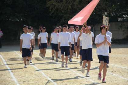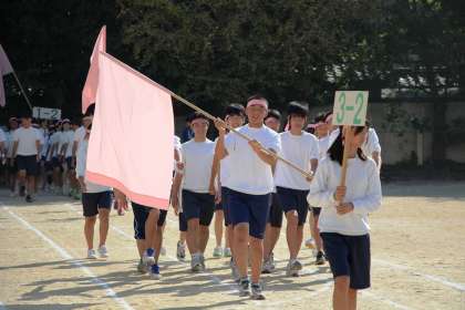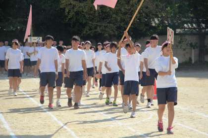 《体育祭−3》赤組の入場! 公開日 2013/10/01 更新日 2013/10/01 学校の様子 次に赤組(ピンク組)の入場です。こちたも青組に負けない堂々とした入場行進です。色別対抗では、激戦が予想されますね!